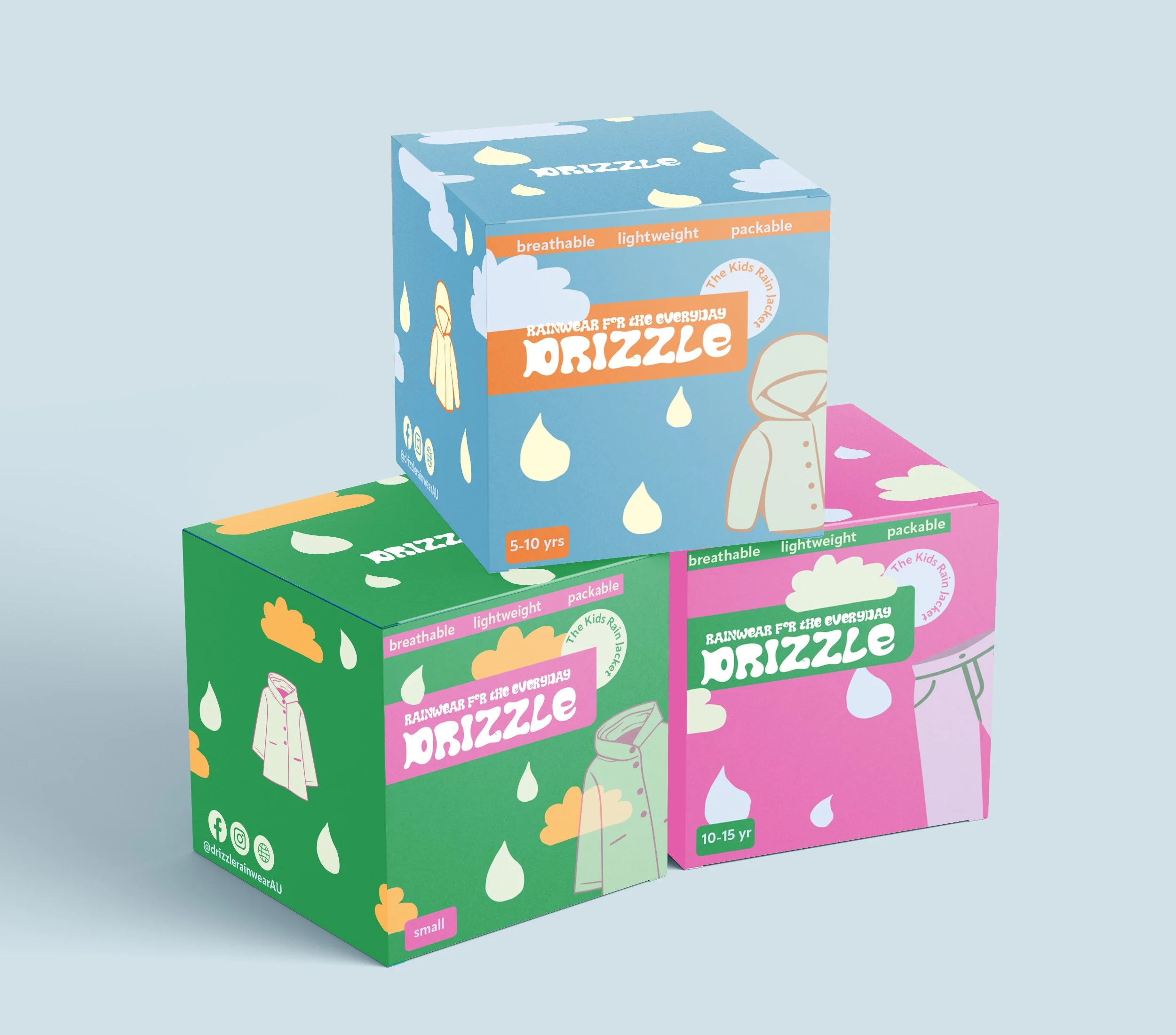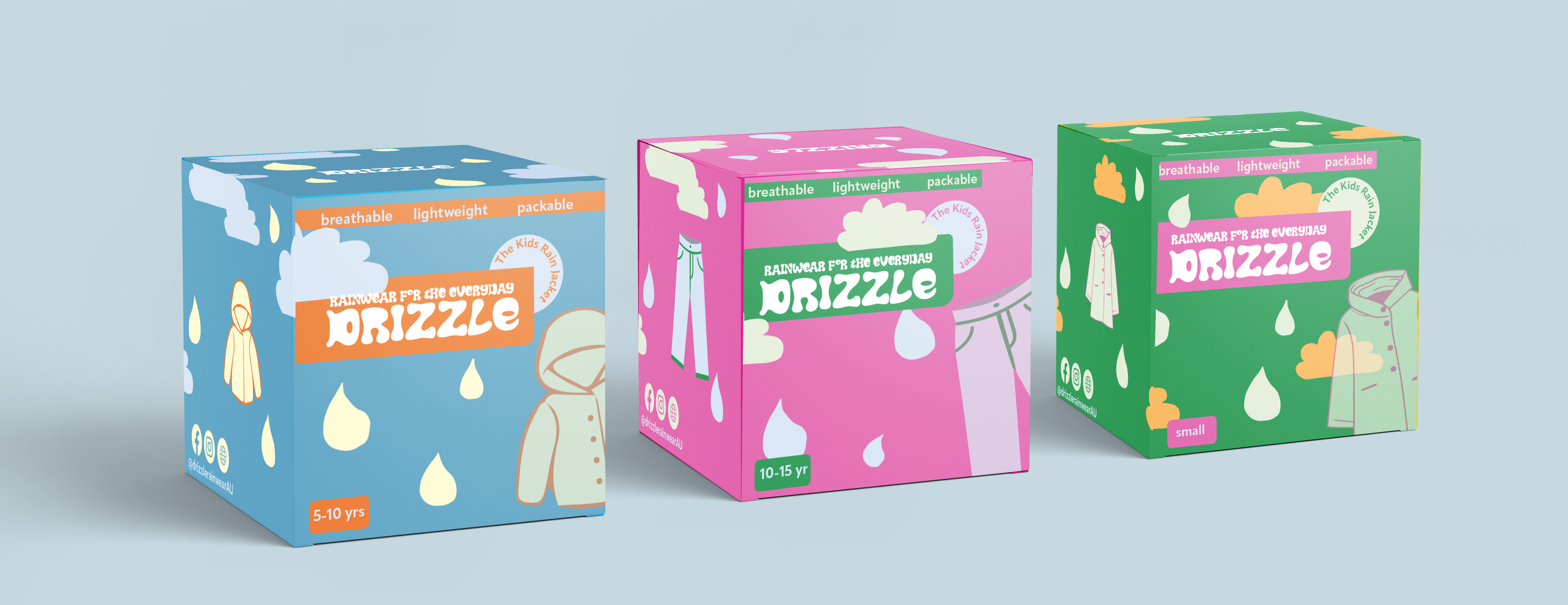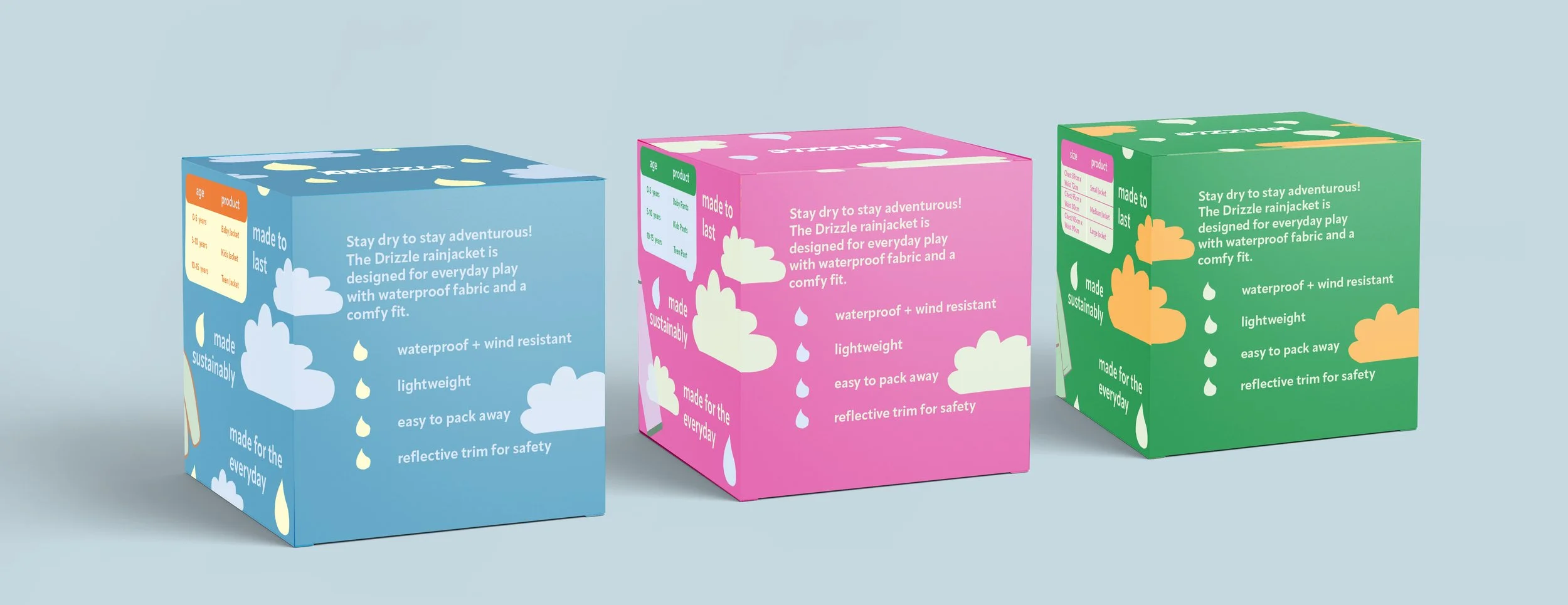 Packaging DesignA playful and illustrative packaging concept for compact rainwear. The designs create a warm, fun and engaging tone for the brand and the products to engage the targeted children and parents.